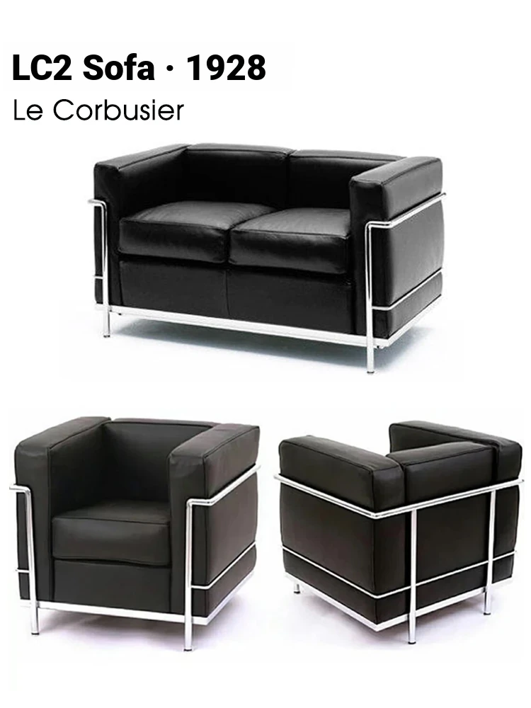 Modern LC2 Le Corbusier Style Office Sofa Set - Scandinavian Mid-Century Stainless Steel and Genuine Leather Armchair Combination for Elegant Workspaces