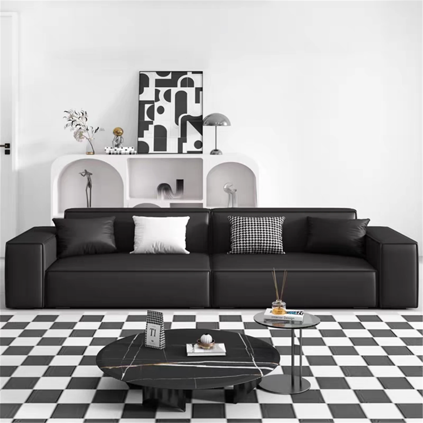 Industrial Style Black Leather Modular Sofa - Stylish Silicone Leather Four-Person Tofu Block Lounge Sofa for Modern Living Rooms