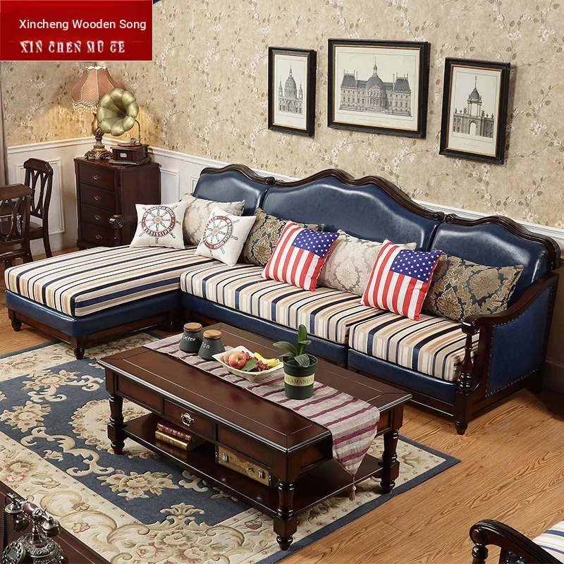 American Country Solid Wood Sofa Set - Stylish Corner Leather Sofa for Living Room with Coffee Table and Cushions, Featuring Vintage European Roman Columns