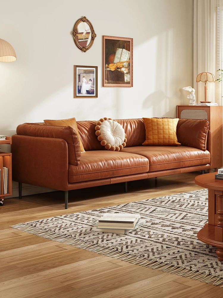 American Vintage Minimalist Modern Straight-Line Sofa for Small Spaces - Nordic Oil-Wax Genuine Leather French Industrial Style Living Room Sofa