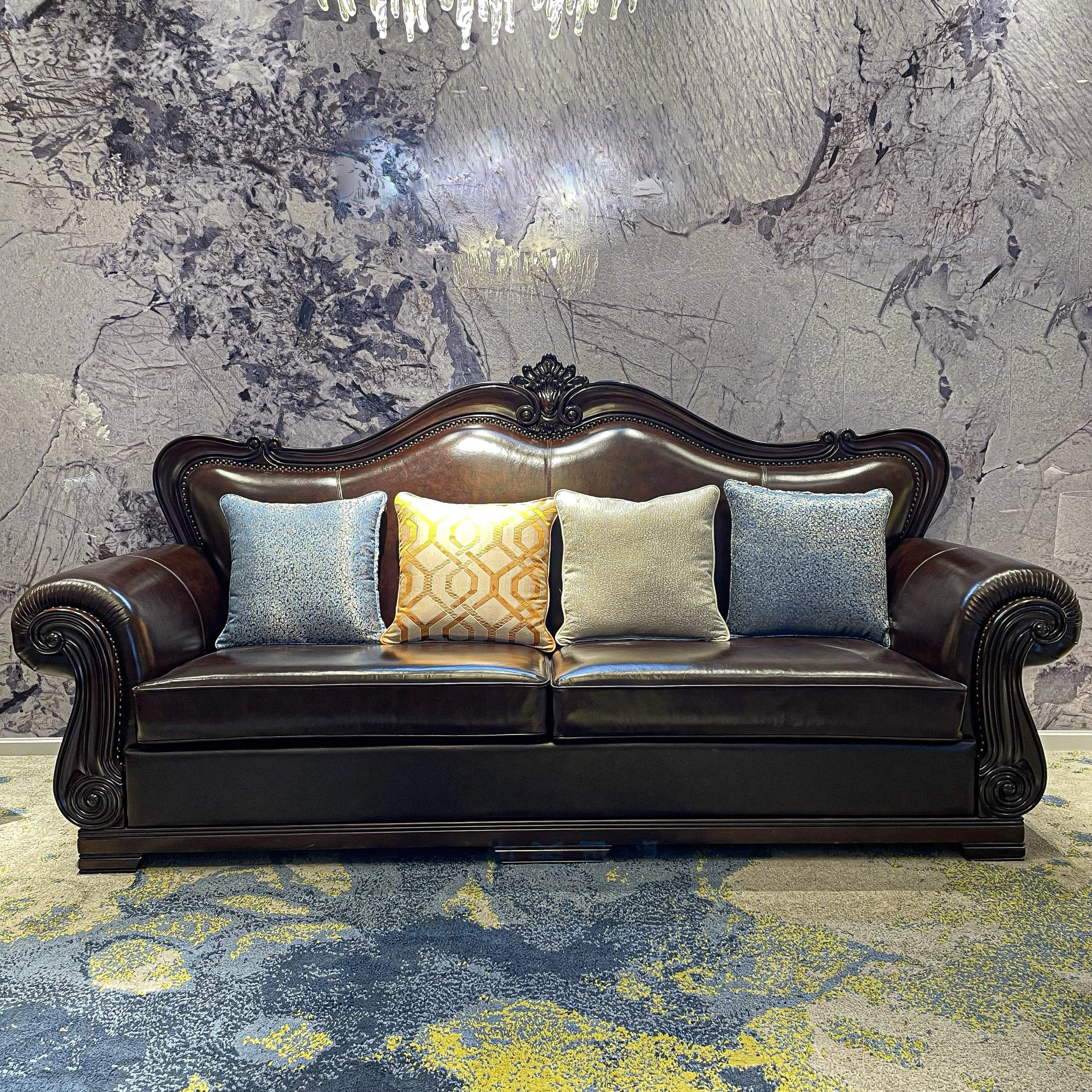 American Genuine Leather Sofa - Solid Wood Vintage Sofa Set, Simple American Style Tiger Chair, European Carved Living Room Furniture