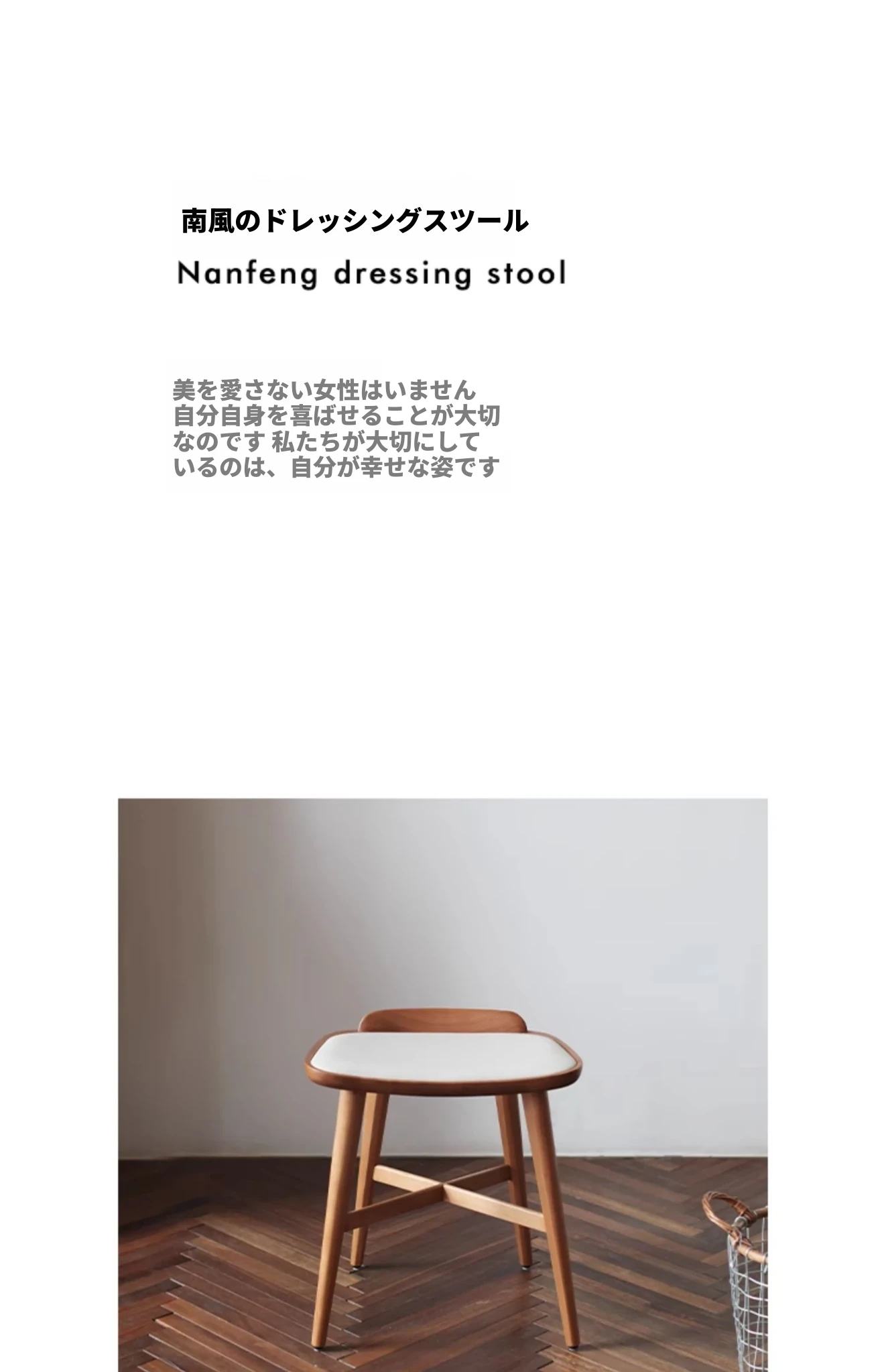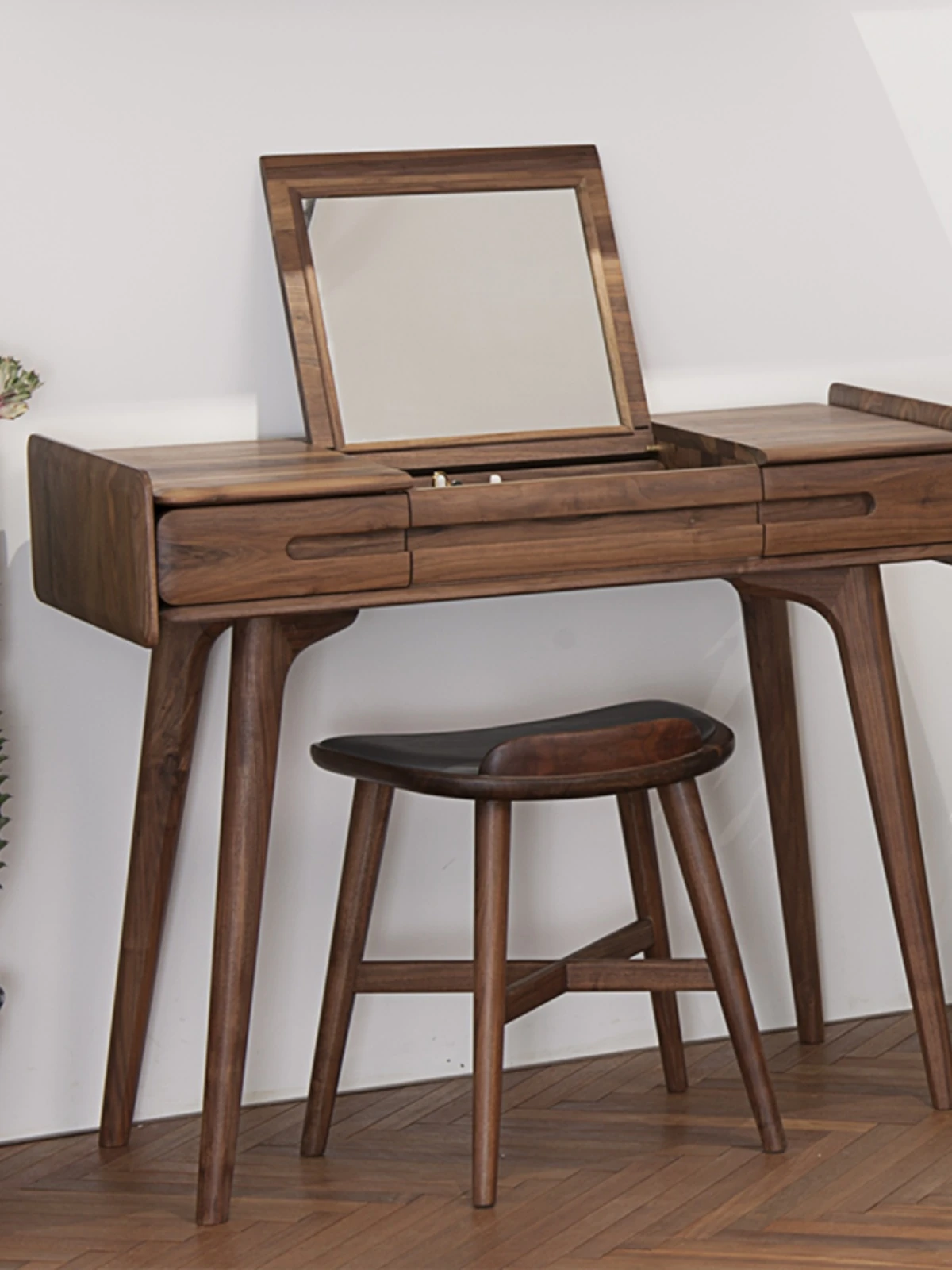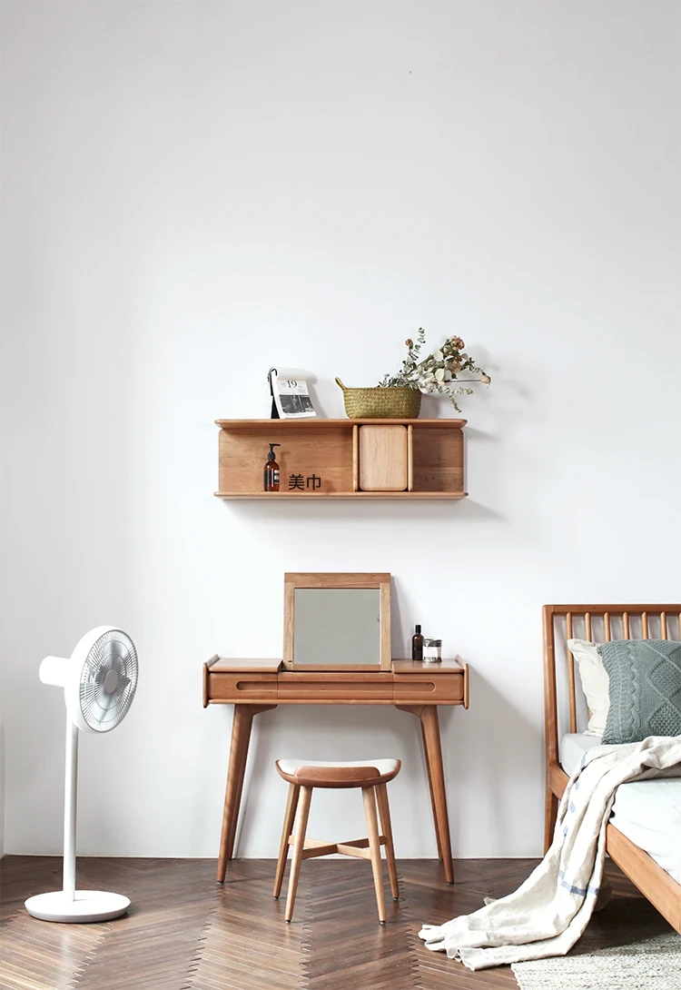 山隐の南風化粧台、北欧スタイルの家具。高級なブラックウォールナットとチェリーの無垢材使用。化粧や靴の着脱に最適な真皮製の多機能スツール。シンプルで洗練されたデザインがあなたの空間を引き立てます!