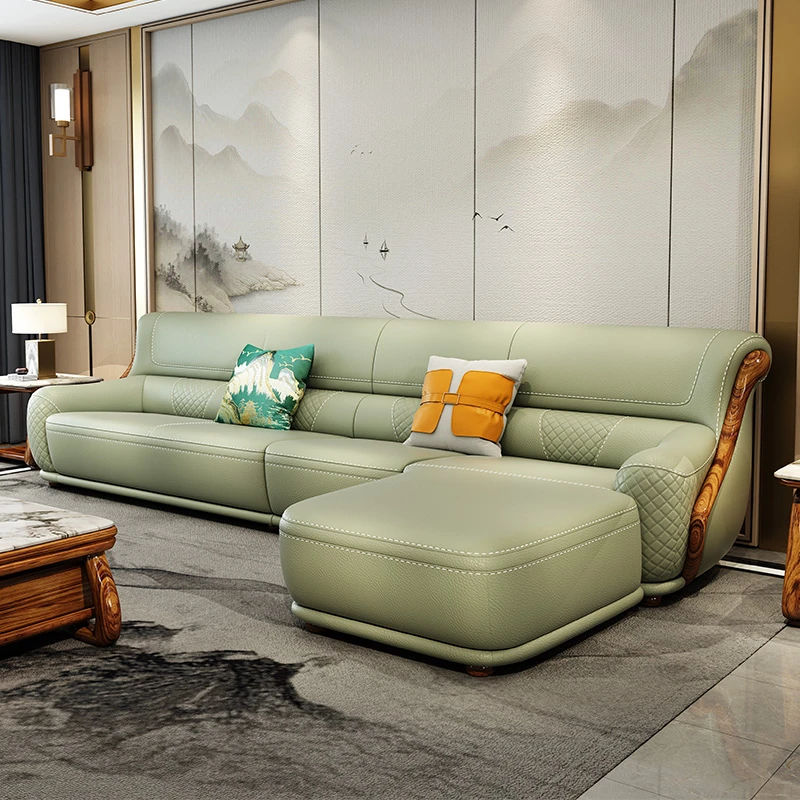2025年新作!現代中式ウッド色ウル金木製レザーコーナー貴妃ソファセット - 高級本革使用、贅沢な居心地を実現!
