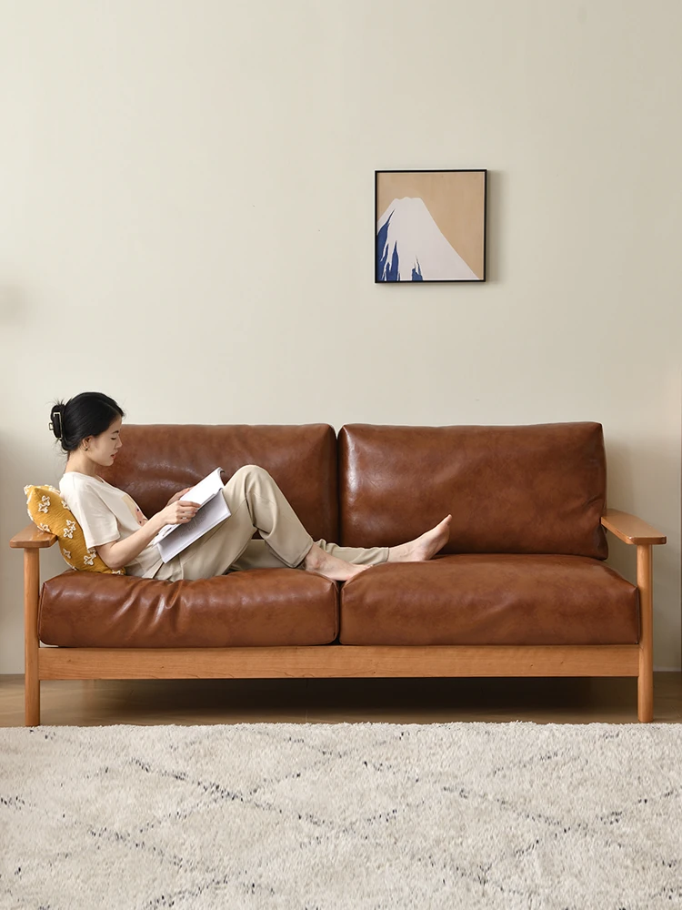 チェリーウッド無垢材使用の本革ソファ!小型住宅にぴったりな和風ナチュラルデザイン。北欧スタイルのリビングに最適な3人掛けオイルワックスレザーソファ。心地よい座り心地で、癒しの空間を演出します。