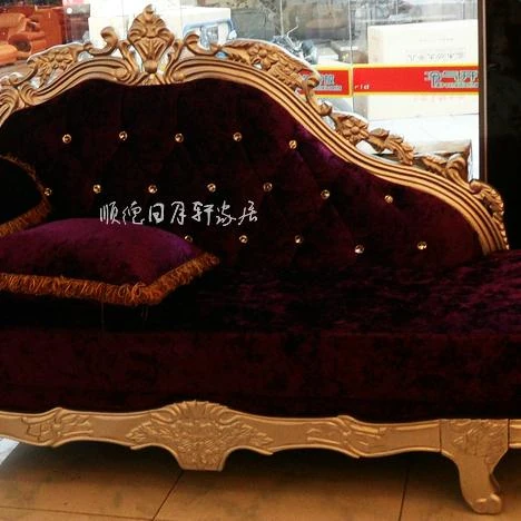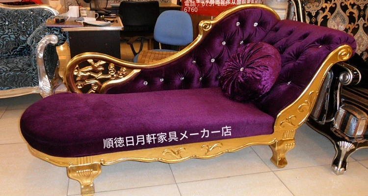 エレガントなヨーロピアンネオクラシックパープルのカウチソファー、豪華な金色の無垢材フレーム&手彫り装飾、小型スペースにも最適!カラーチェンジ可能で、お部屋の雰囲気を簡単に変えられます。