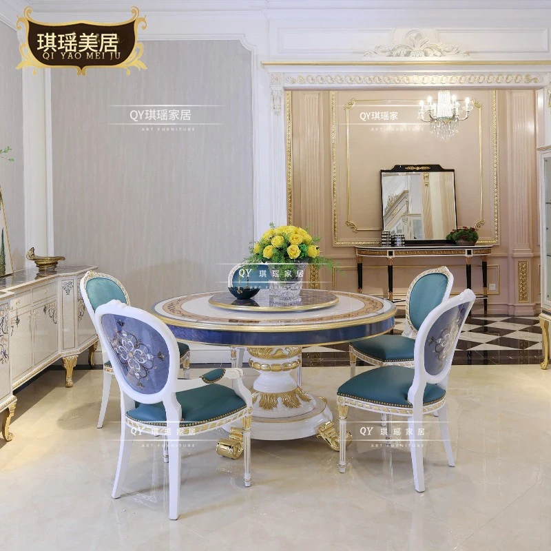 琪瑶フレンチラグジュアリー別荘用ラウンドダイニングテーブル - ヨーロピアンクラシックな木目と貝殻のインレイが美しい、広々とした大邸宅に最適な高級家具。食卓を華やかに演出し、特別なひとときを提供します。